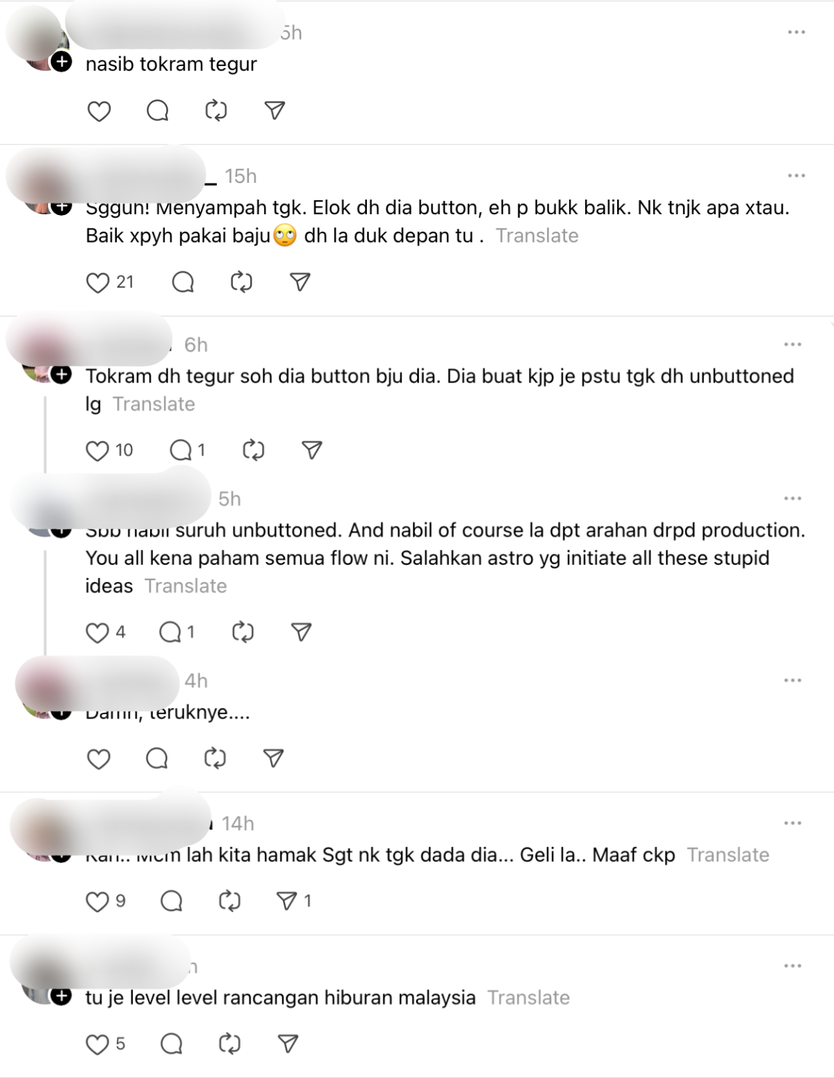 Netizen itu turut mempersoalkan tindakan Que yang membutang baju kemejanya sampai ke atas serta beranggapan ianya kurang sesuai kerana rancangan itu tontonan keluarga.