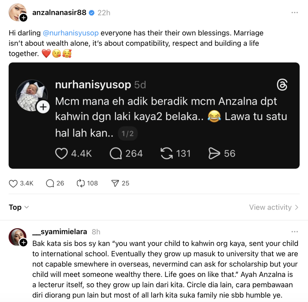 Menerusi hantaran di Threads, Anzalna menjawab komen seorang netizen yang mempersoalkan mengenai adik beradik pelakon itu yang mempunyai pasangan yang kaya.