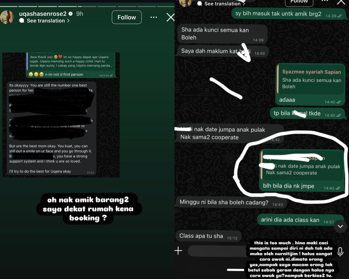 Menerusi hantaran di Insta Story, Uqasha berkata hal melibatkan anak, termasuk perjumpaan sudah tentu ianya diketahui olehnya sebagai ibu Hawra Uqaira.