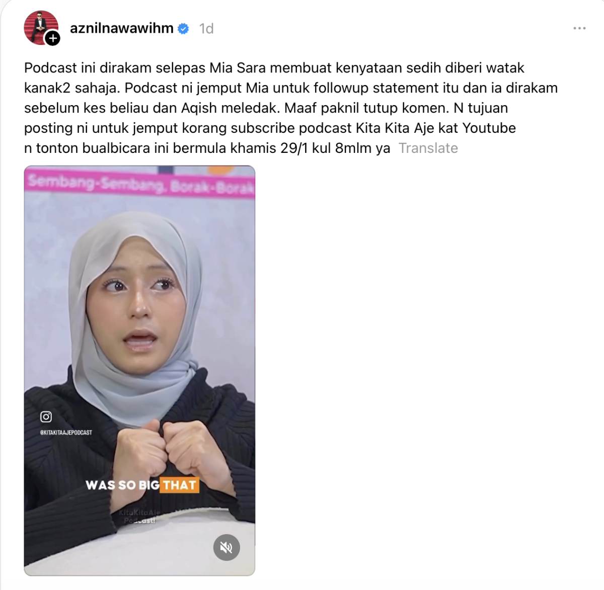 “Podcast ini dirakam selepas Mia Sara membuat kenyataan sedih diberi watak kanak-kanak sahaja. Podcast ini jemput Mia untuk ‘follow up’ kenyataan itu dan ia dirakam sebelum kes beliau dan Aqish meledak.