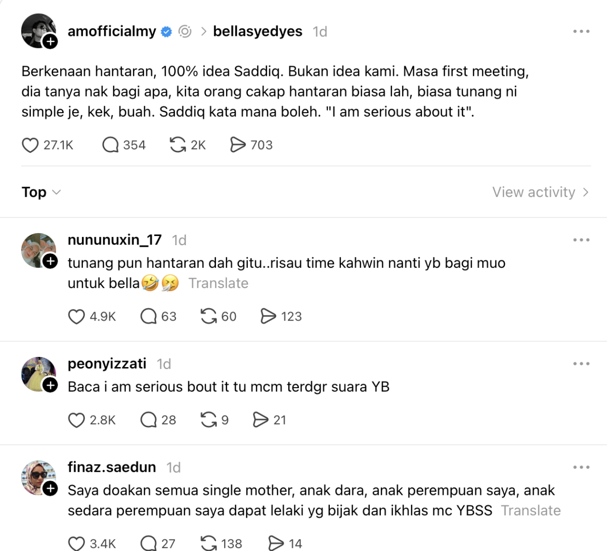 “Berkenaan hantaran, 100% idea Saddiq. Bukan idea kami. Masa first meeting, dia tanya nak bagi apa.