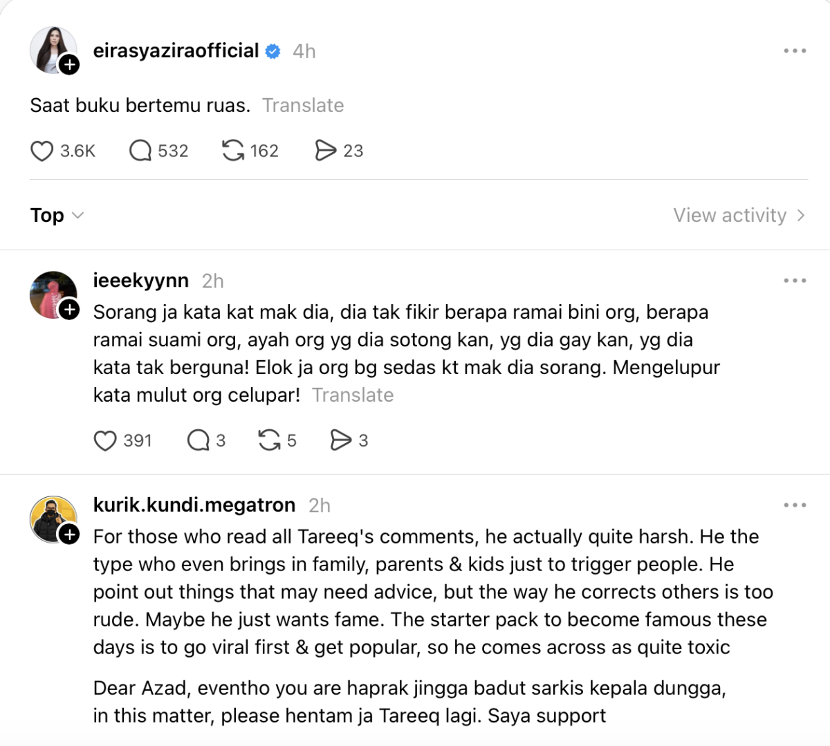 Hantaran Eira itu mendapat pelbagai reaksi daripada netizen dimana ada yang bersetuju dengan tindakan Azad.