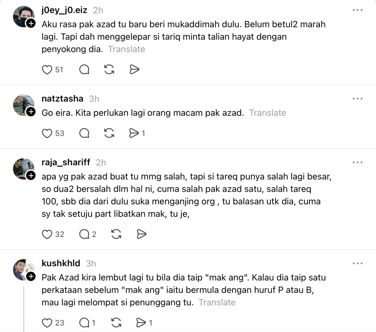 Terdahulu, Tareq dilihat memuat naik hantaran memaparkan mesej berbualannya dengan Azad yang didakwa menggelar ibunya dengan panggilan tidak baik.