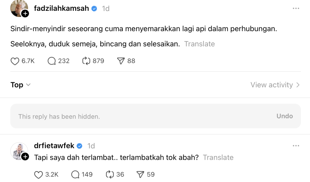 “Sindir-menyindir seseorang cuma menyemarakkan lagi api dalam perhubungan, Seeloknya, duduk semeja, bincang dan selesaikan,” tulisnya.