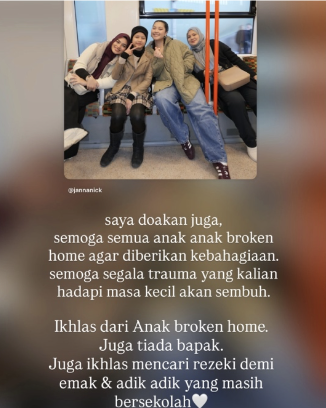 Sementara itu, Janna turut berkata dia juga berasal dari latar belakang yang sama dan bangkit untuk ibu serta adik-adiknya.