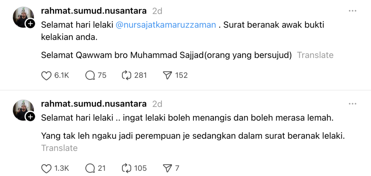 Turut menjadi perhatian, dalam satu hantaran lain PU Rahmat berkata kaum lelaki juga boleh menanigs dan berhak merasa lemah melainkan yang berpura-pura menganggap diri mereka perempuan.