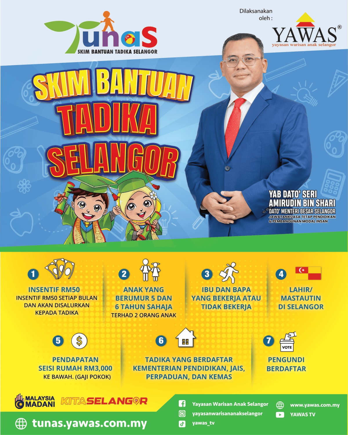 Selain itu, terdapat juga Program TUNAS (Skim Bantuan Tadika Selangor) yang menyasarkan pendidikan awal kanak-kanak. Program ini menyediakan subsidi RM50 sebulan untuk yuran tadika bagi kanak-kanak berumur lima dan enam tahun daripada keluarga berpendapatan rendah.