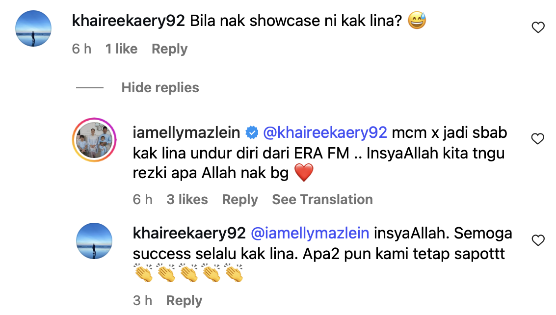 “Macam tak jadi sebab Kak Lina undur diri dari Era FM. InsyaAllah kita tunggu rezeki apa Allah nak bagi,” tulisnya.