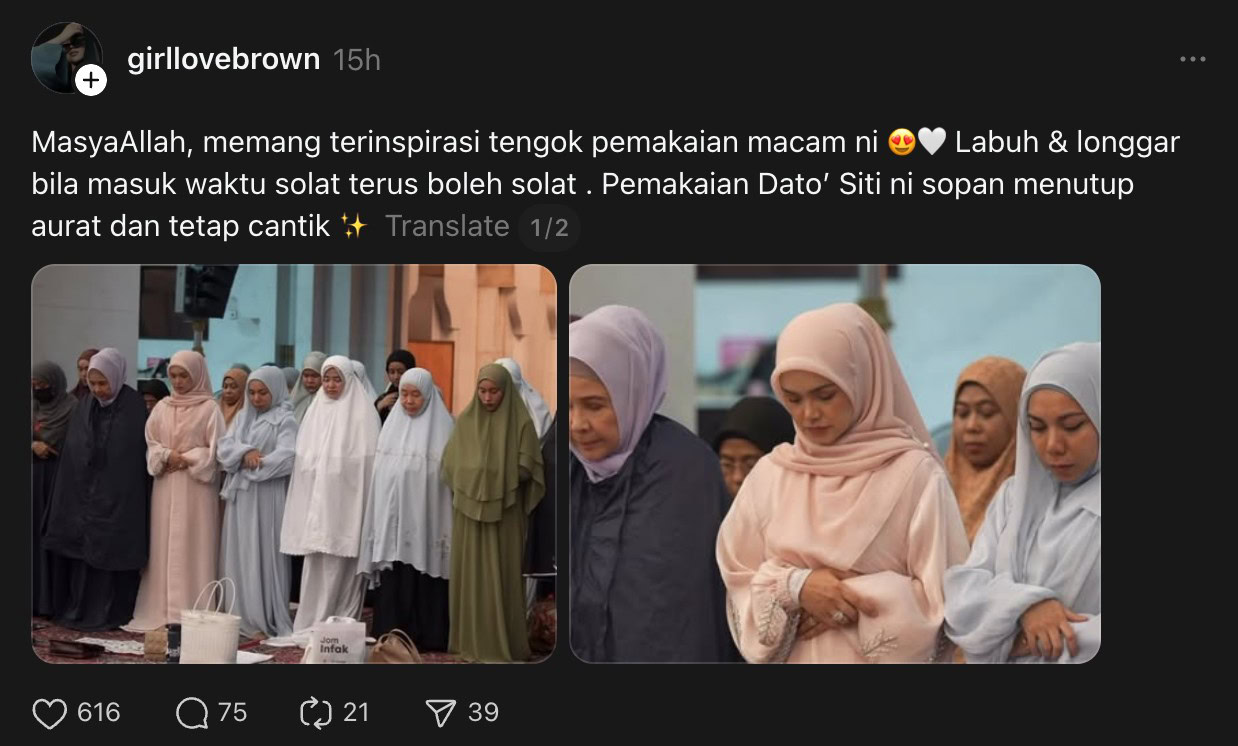 Terdahulu, tular dua keping gambar Siti Nurhaliza atau mesra disapa sebagai TokTi di aplikasi Threads yang kelihatan sedang menunaikan solat berjemaah dipercayai ketika menghadiri satu majlis berbuka puasa.