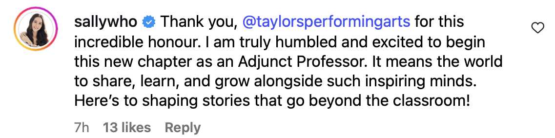 Perlantikan tersebut turut diumumkan menerusi Instagram rasmi taylorsperformingarts serta mengalu-alukan kehadiran Siti Saleha