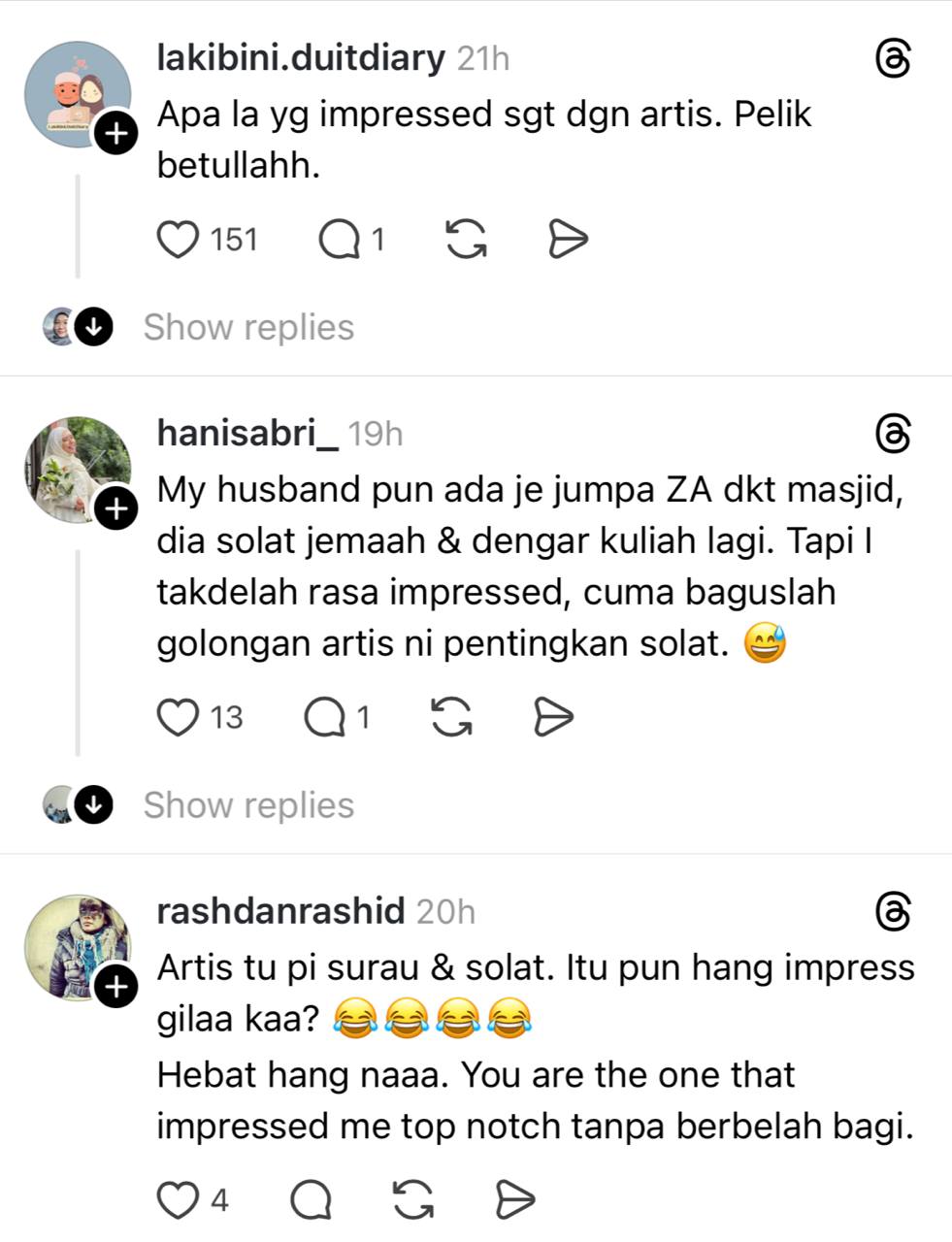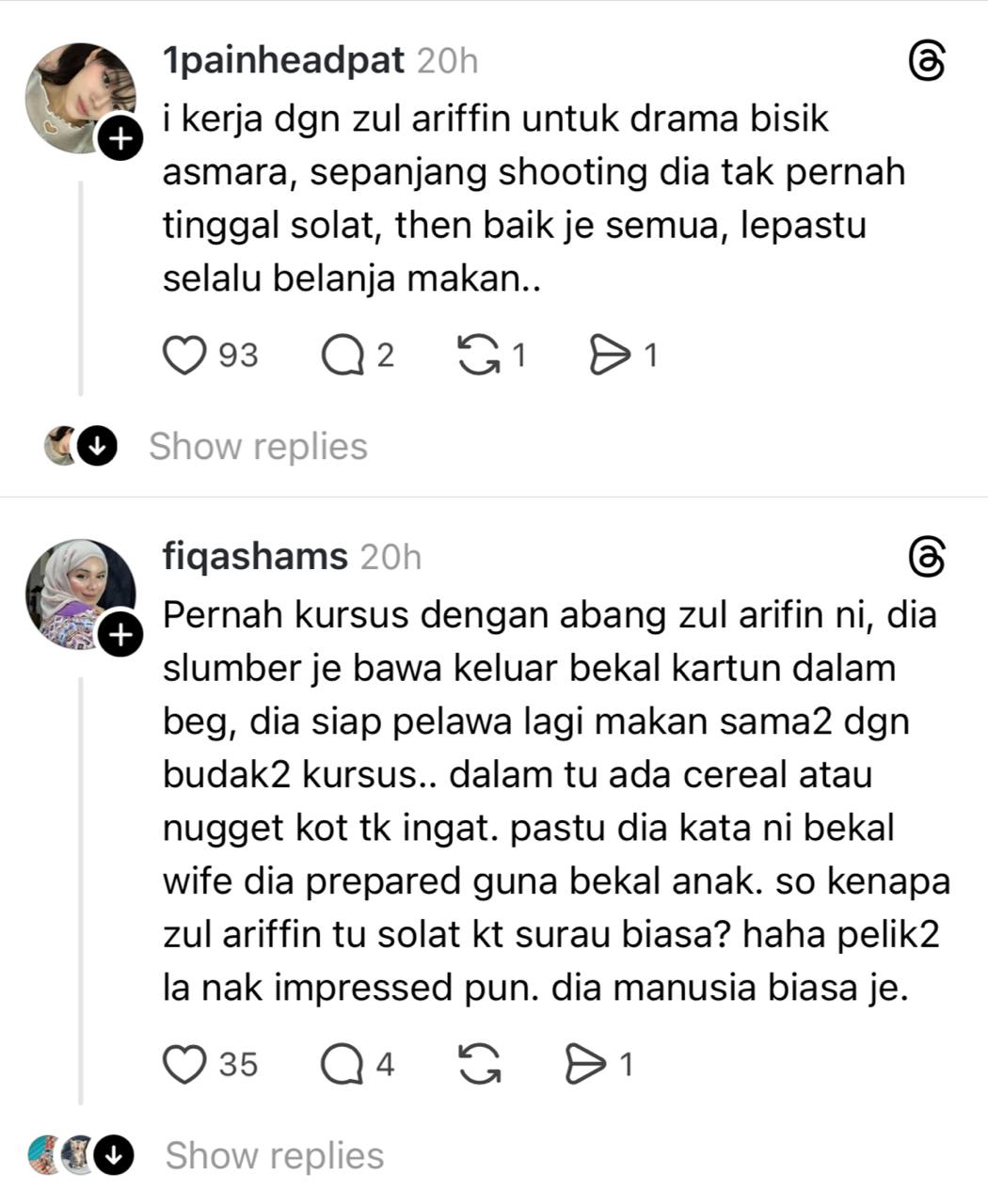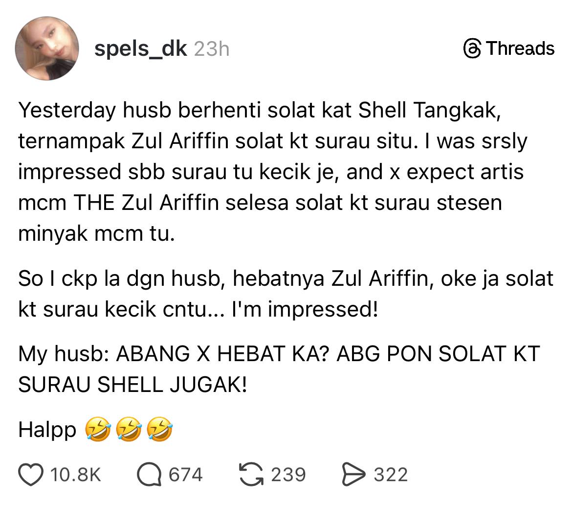 “Saya cakap dengan suami, ‘hebatnya Zul Ariffin. Okay saja solat dekat surau kecil macam itu. Kagum,” ciapan individu itu di Threads.
