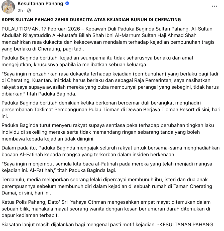 Menerusi hantaran di Facebook Kesultanan Pahang, baginda bertitah, kejadian seumpama itu tidak seharusnya berlaku dan amat mengejutkan, khususnya apabila ia melibatkan sebuah keluarga.