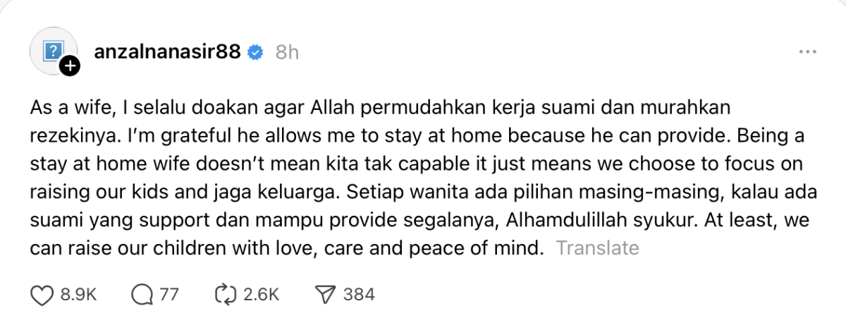 “Setiap wanita mempunyai pilihan masing-masing, jika ada suami yang menyokong dan mampu menyediakan segala-galanya, Alhamdulillah syukur.