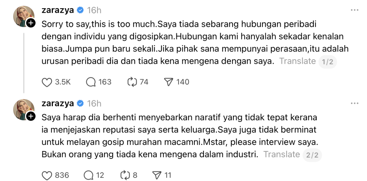 Menerusi satu hantaran di Threads, Zara berkata dia menyifatkan dakwaan itu keterlaluan serta menjelaskan dia tidak ada sebarang hubungan dengan usahawan itu.