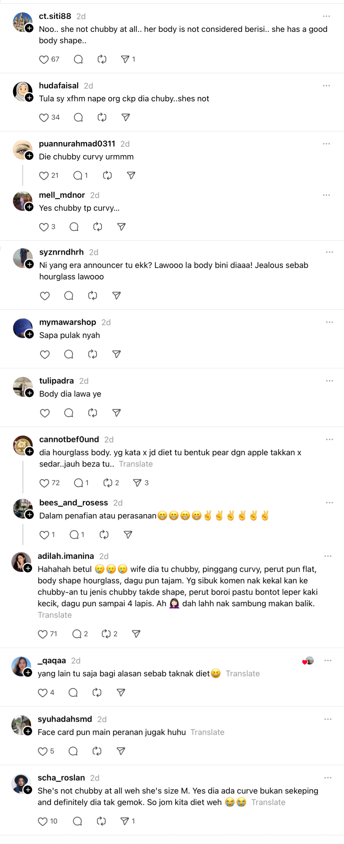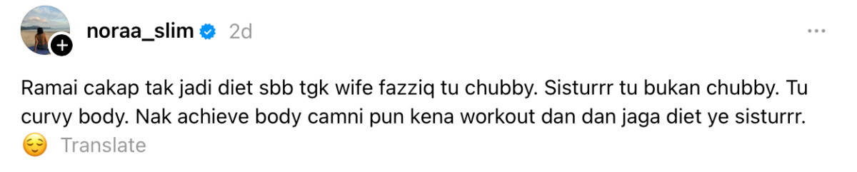 “Ramai cakap tak jadi diet sbb tgk wife fazziq tu chubby. Sistur tu bukan chubby. Tu curvy body. Nak achieve body camni pun kena workout dan dan jaga diet ye sistur,” tulis individu itu.