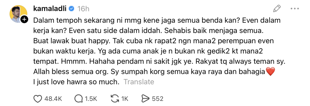 Menerusi hantaran di Threads, Kamal mengakui dia perlu menjaga segala batas pergaulan termasuk ketika bekerja meskipun temph idah hanya dilalui oleh bekas isterinya.