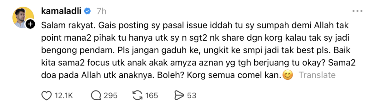 “Gais posting saya pasal isu iddah tu saya sumpah demi Allah tak tuju mana-mana pihak tu hanya untuk saya dan sangat-sangat nak kongsi dengan korang kalau tak saya jadi bengong pendam. Tolong jangan gaduh ke, ungkit ke sampai jadi tak best,” katanya.