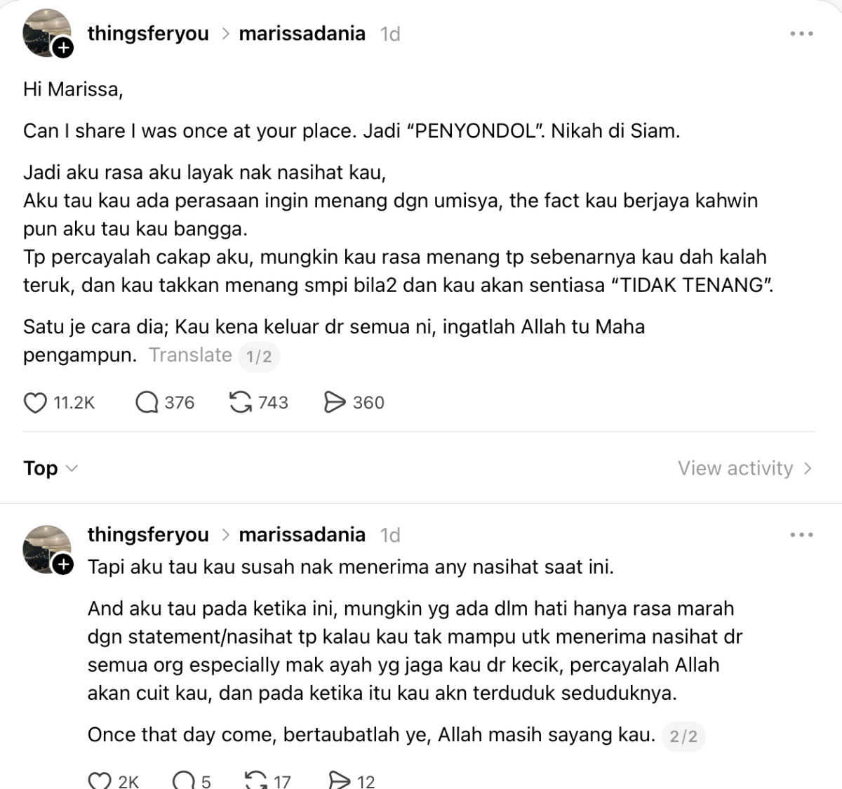 Seorang wanita memuat naik hantaran menitipkan nasihat buat pempengaruh media sosial, Marissa Dania susulan isu rumah tangganya.