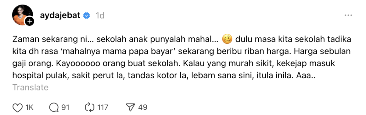 Pelakon dan penyanyi Ayda Jebat menjadi perhatian ramai apabila meluahkan pendapatnya mengenai kos pendidikan anak-anak yang semakin mahal.