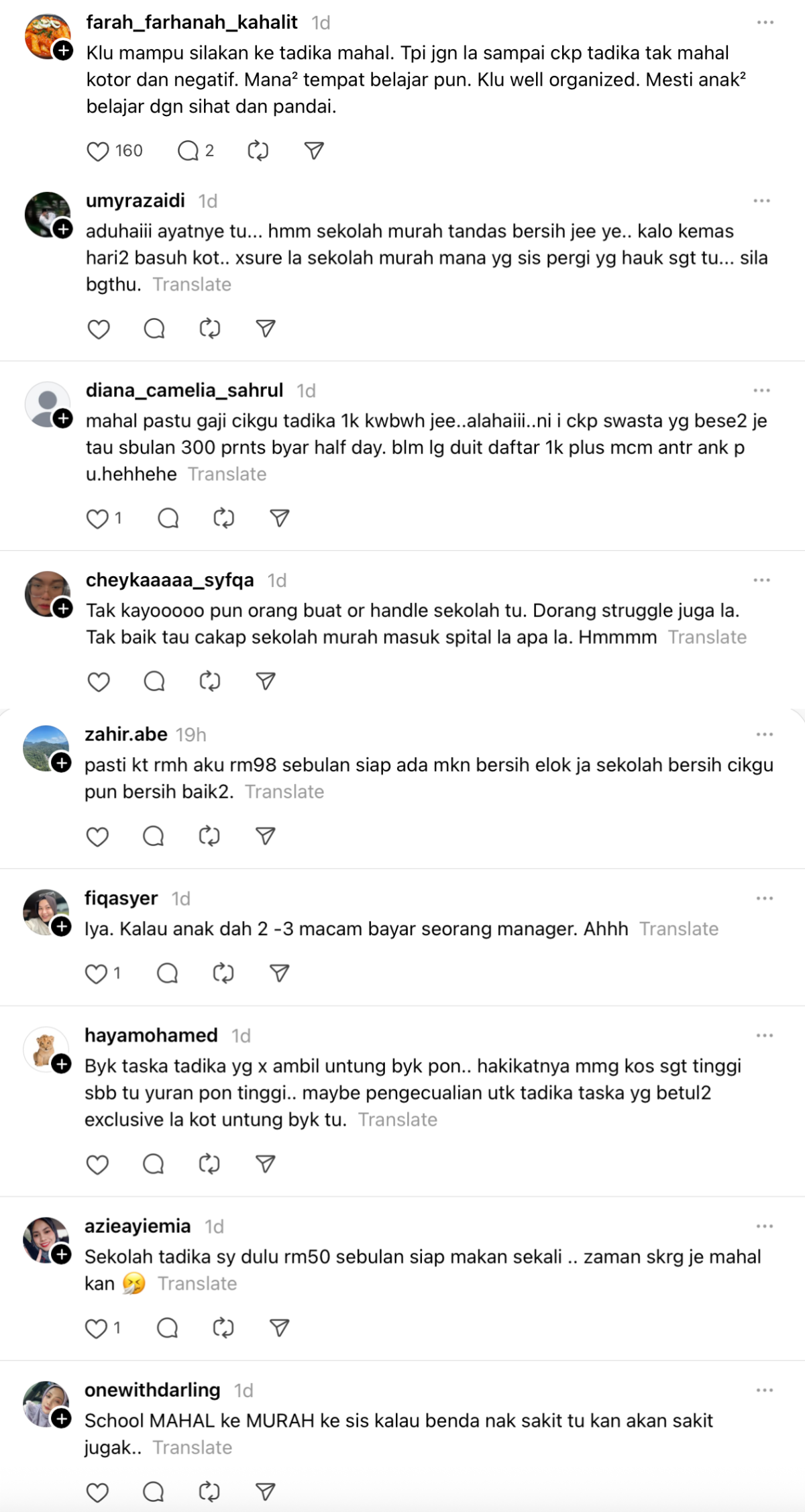 “Zaman sekarang ni…sekolah anak punyalah mahal. Dulu masa kita sekolah tadika kita dah rasa ‘mahalnya mama papa bayar’. Sekarang beribu riban harga. Harga sebulan gaji orang.